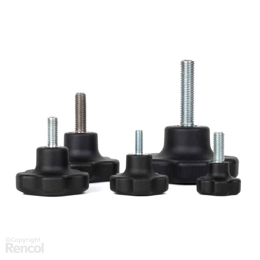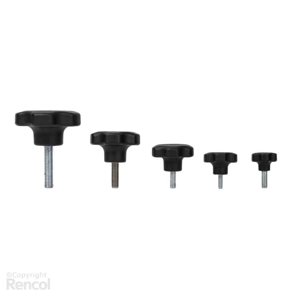 The high impact resistant thermoplastic solid lobe knob is offered with a choice of zinc plated steel or stainless-steel male thread, and brass or stainless steel female threaded insert. We stock a wide range of sizes with diameters ranging from 30 to 80mm and threads from M5 to M16 and thread lengths from 10mm to 60mm.